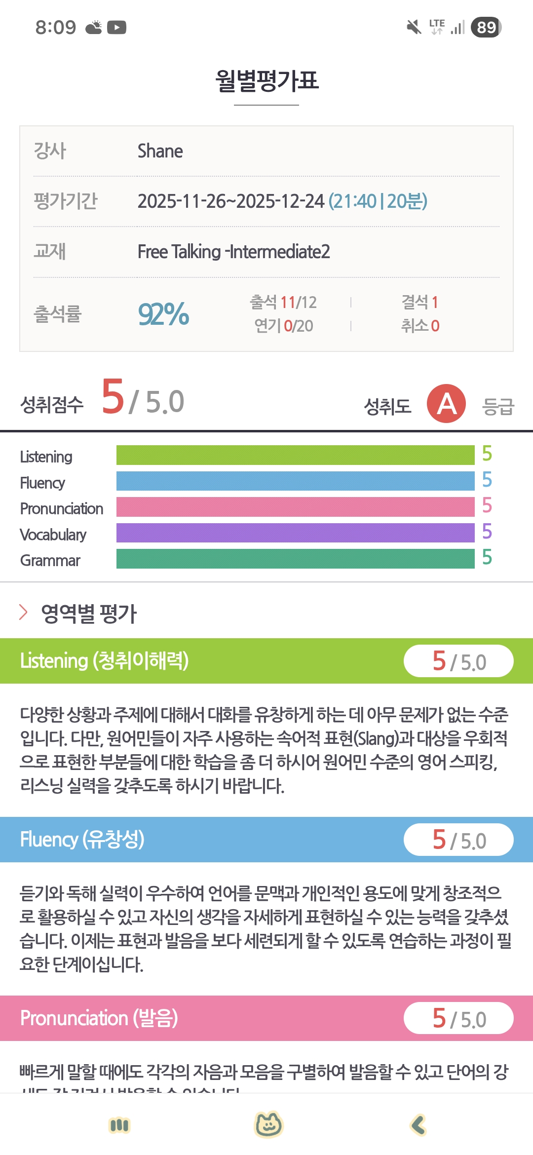 안녕하세요 회원님^^ 바쁜 일정 속에서도 이티폰 수업 꾸준히 참여해주셔서 감사합니다. 외국인과의 대화에서도 자연스럽게 말할 수 있고 학교 수행평가에서도 좋은 결과 받으셨다니 저희도 기쁩니다. 앞으로도 강사님과 다양한 주제들 활용하여 친구처럼 편안하면서도 유익한 수업 이어가시길 응원하겠습니다. 감사합니다♡