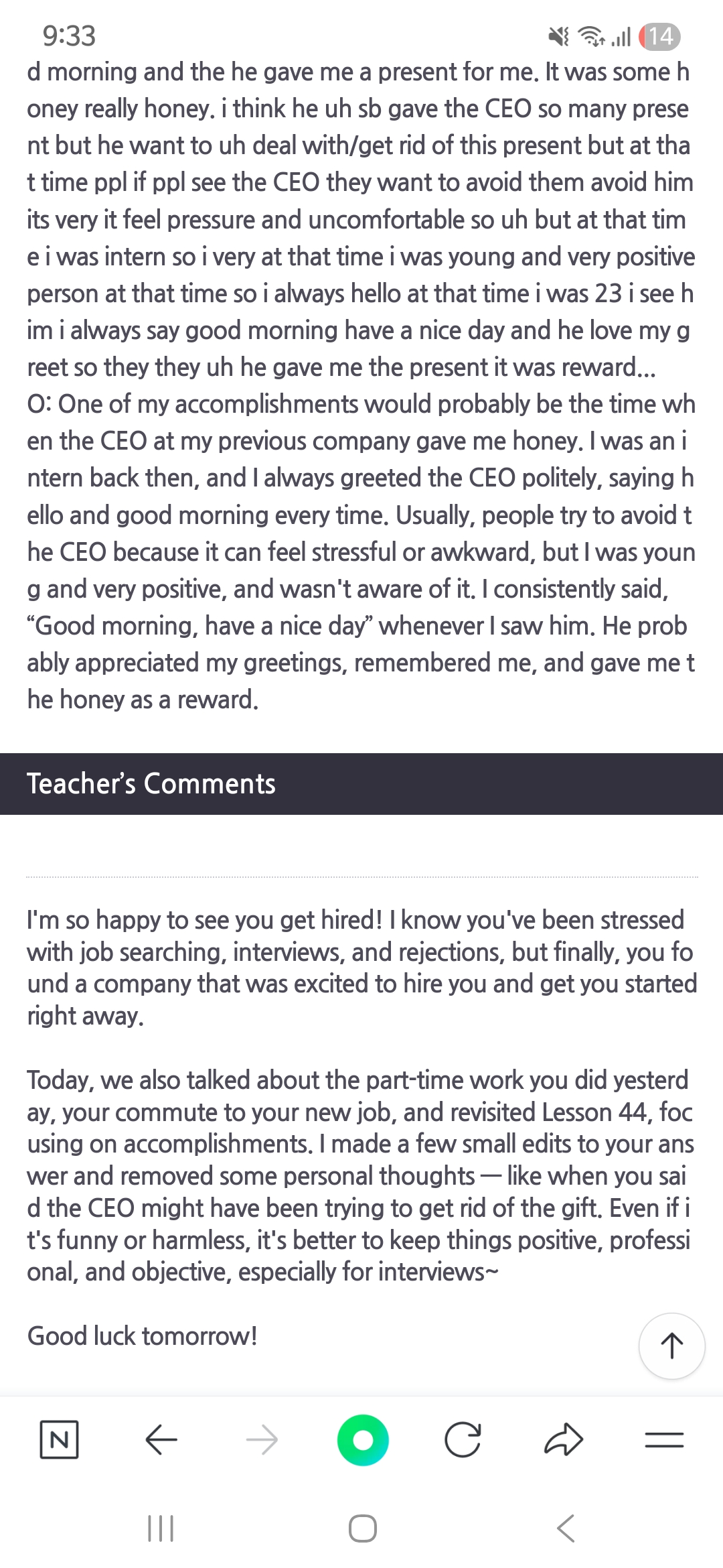 선생님은 정말 똑똑하시고 따뜻한 분이시며, 단순히 영어를 가르쳐 주시는 것이 아니라 각 인터뷰에서 어떻게 답변해야 하는지를 구체적으로 알려주셨습니다.