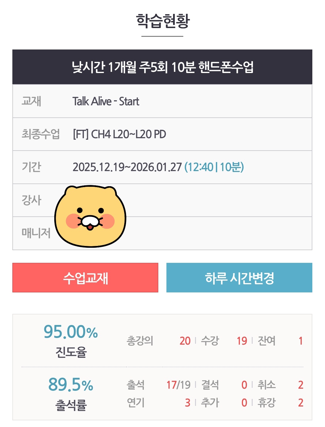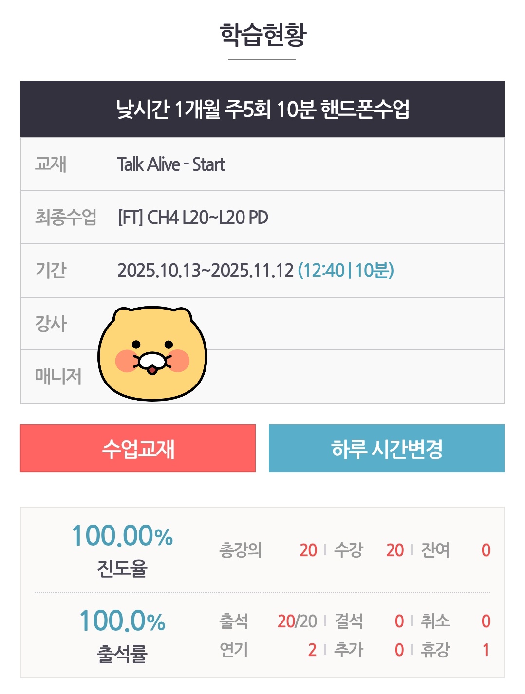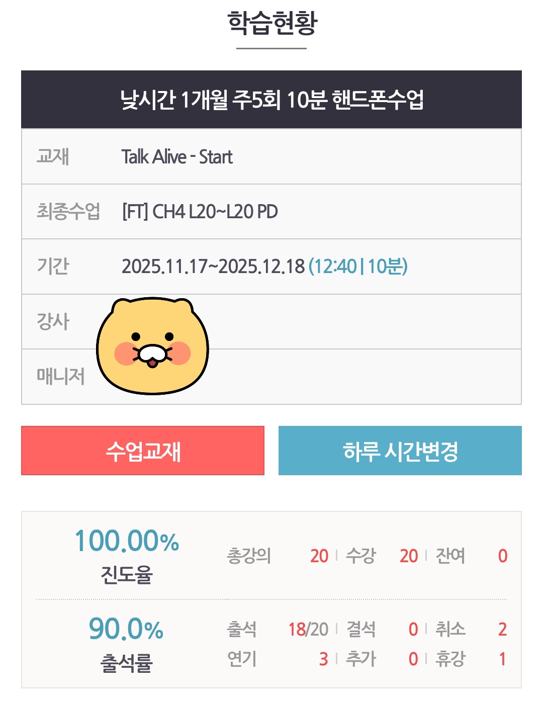 그런데 전화영어는 달랐어요. 정해진 시간에 선생님께서 전화가 오니까, 제가 도망칠 틈이 없더라고요. 저는 점심시간(12:40~12:50)에 수업을 하는데, 진짜 12시쯤부터 연기/취소 가능한 시간(12:10)까지 “취소할까...말까...”를 수없이 고민합니다. 연기는 쓸 수 있는 한도까지 전부 쓰고, 종종 취소도 사용하지만 그래도 결국엔 “아, 10분인데 그냥 하자” 하고 하게 되더라고요. 그게 쌓이다 보니까 3달 동안 평균 출석률 90% 이상을 유지할 수 있었던 것 같아요.