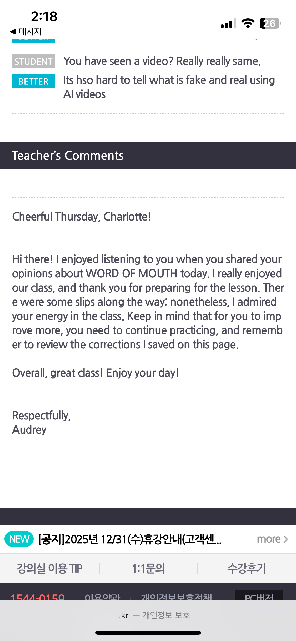 선생님도 밝으시고 제가 잘 못 알아들으면, 천천히 또박또박 알려주시거나 텍스트를 화면에 띄어주셔서 부담이 덜합니다. 발음이 이상한 거는 바로바로 알려주셔서 좋았어요. 수업이 끝난 후에도 수업시간에 말씀 못 해주셨던 문법과 발음 교정도 더 추가해서 코멘트 주십니다. 수업 영상이 녹화가 돼서 복습할 때 도움이 됩니다. 잘 발음하고 있다거나, 꽤 빠르게 말하고 있다고 생각했는데 녹화본 다시 보면 발음을 흘리거나 부족한 것들이 바로바로 보이더라고요.