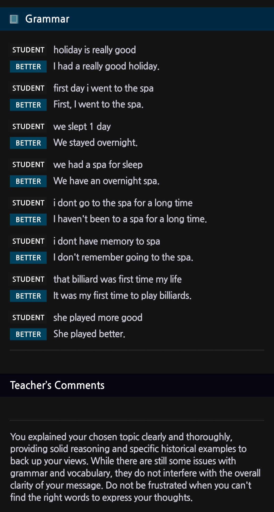 하지만 지금은 그때보다 원어민 선생님과 많은 얘기들을 할 수 있게 되었고, 자연스럽게 대화를 이어가는 능력도 향상되었습니다. 또한 말투도 자연스러워졌습니다.