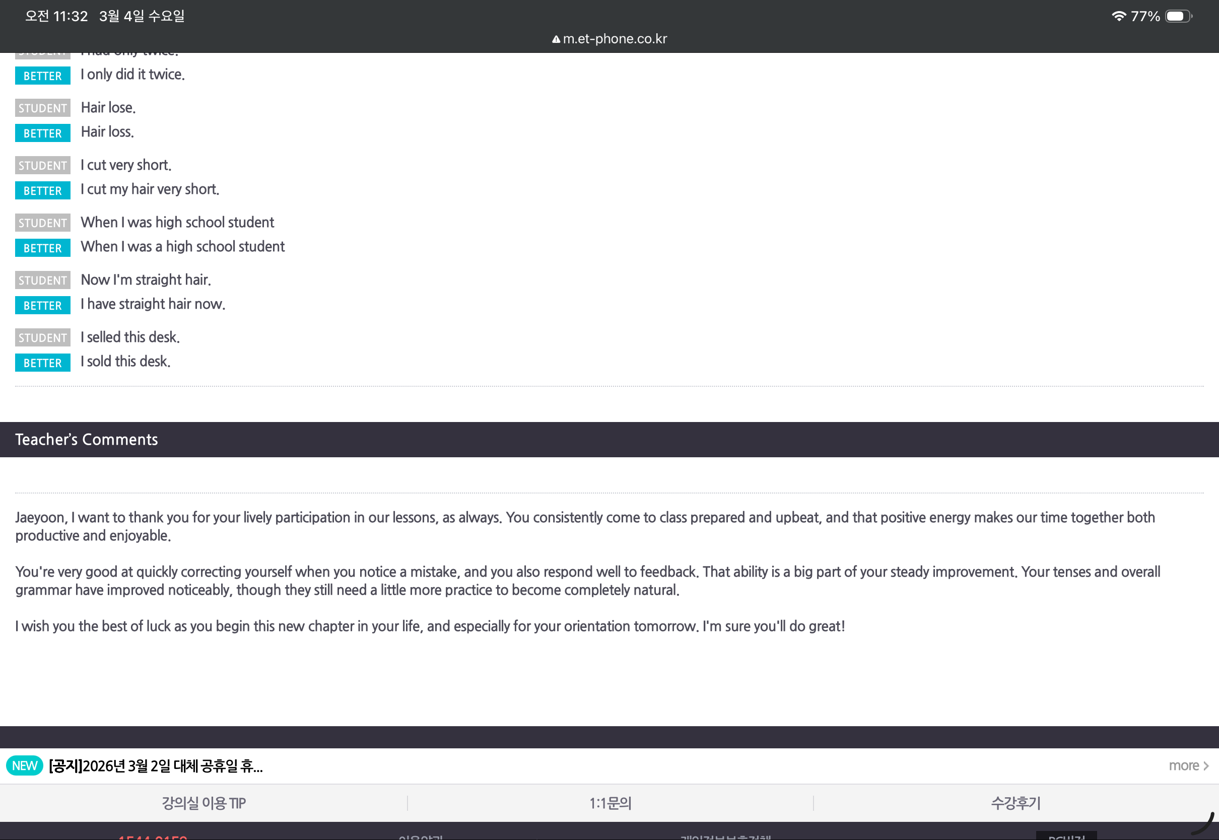 그리고 예전에는 교재를 끝내는 것에만 집중했다면, 이제는 수업 중 프리토킹의 비중이 점점 늘어나고 있는데 그날그날의 일상 이야기를 나누면서 자연스럽게 표현을 배우다 보니, 수업 시간이 더 기다려지고 점점 더 재미있어지더라고요.ㅎㅎ (선생님도 피드백 때 이번 수업 재밌었다고 해주시면 기분이 엄청 좋아지더라는..ㅎㅎ) 영어 공부가 ‘해야 하는 일’이 아니라 ‘하고 싶은 시간’으로 바뀌고 있다는 점이 가장 큰 변화인 것 같습니다.