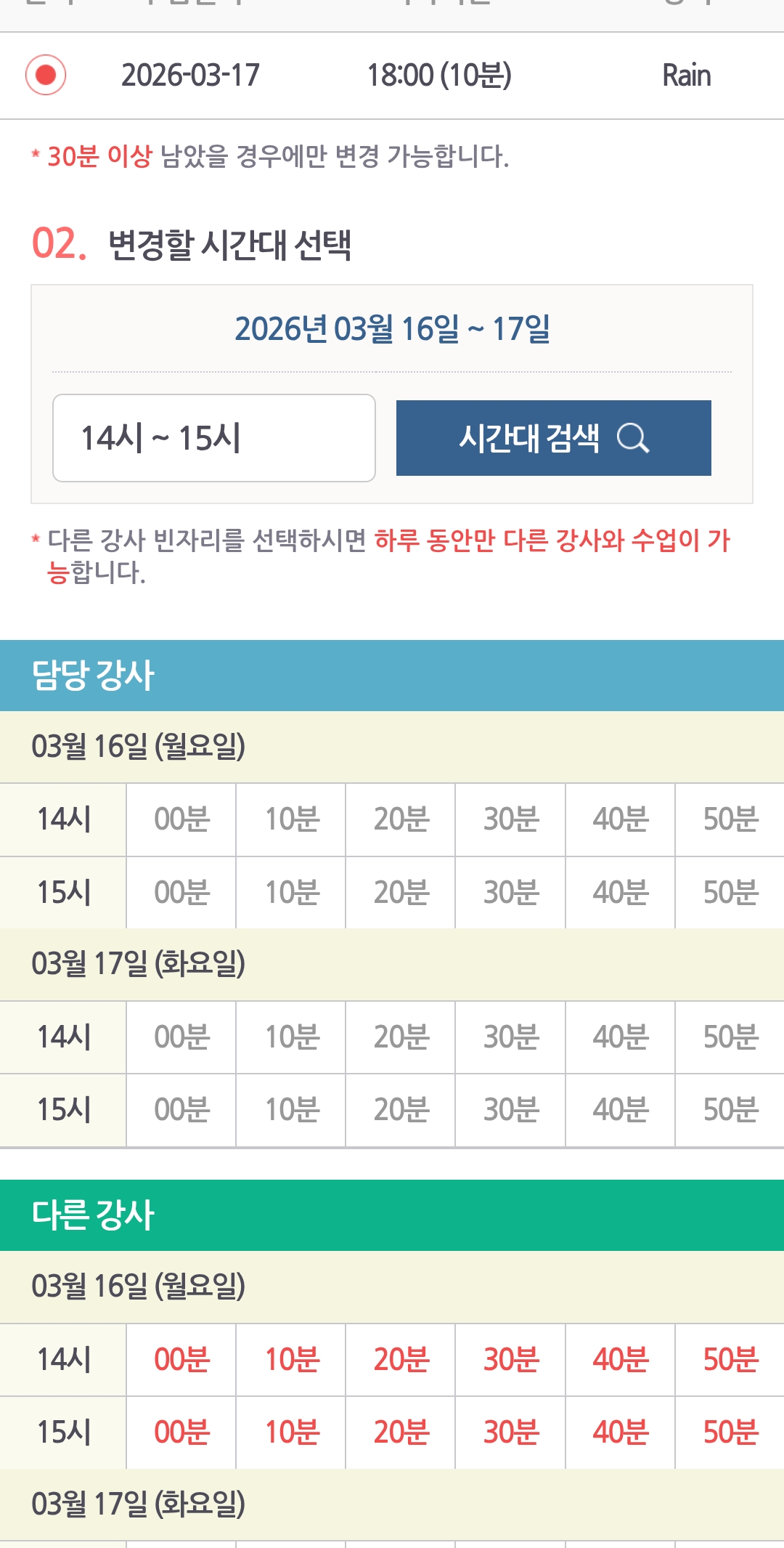 수업시작하기 30분전까지 언제든지 시간변경 가능하고 연기도 가능하구요