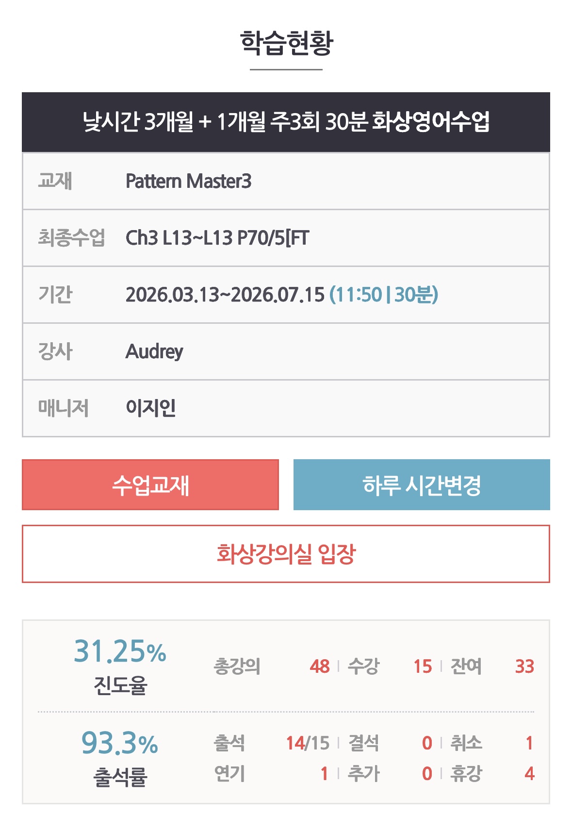 지금 직장과 대학 학업을 병행하고 있어서 영어 회화까지 할 수 있을까 걱정했는데 중간고사 같은 기간은 연기 처리(최대 6회)를 하면 되었고 무엇보다 Audrey 선생님이과의 대화가 너무 좋아서 화상영어가 제 유일한 취미가 되었네요ㅋㅋㅋㅋ