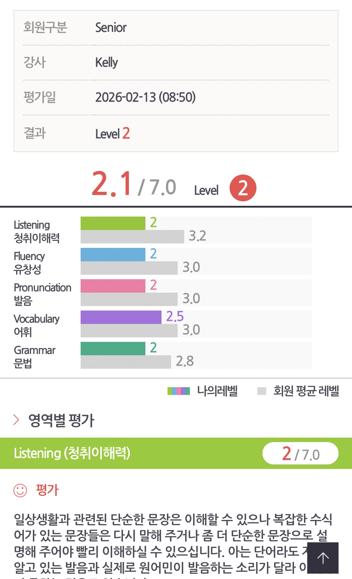 위에는 제 첫 레벨테스트 결과고 이번 한달차에 월평가에는 2.38로 한 달 만에 0.2가 올랐어요! 특히 듣기와 유창성 파트 점수가 많이 상승했습니다ㅎㅎ 앞으로 남은 3달 더 꾸준히 해서 3.5를 만들어 보는게 목표입니다 :)